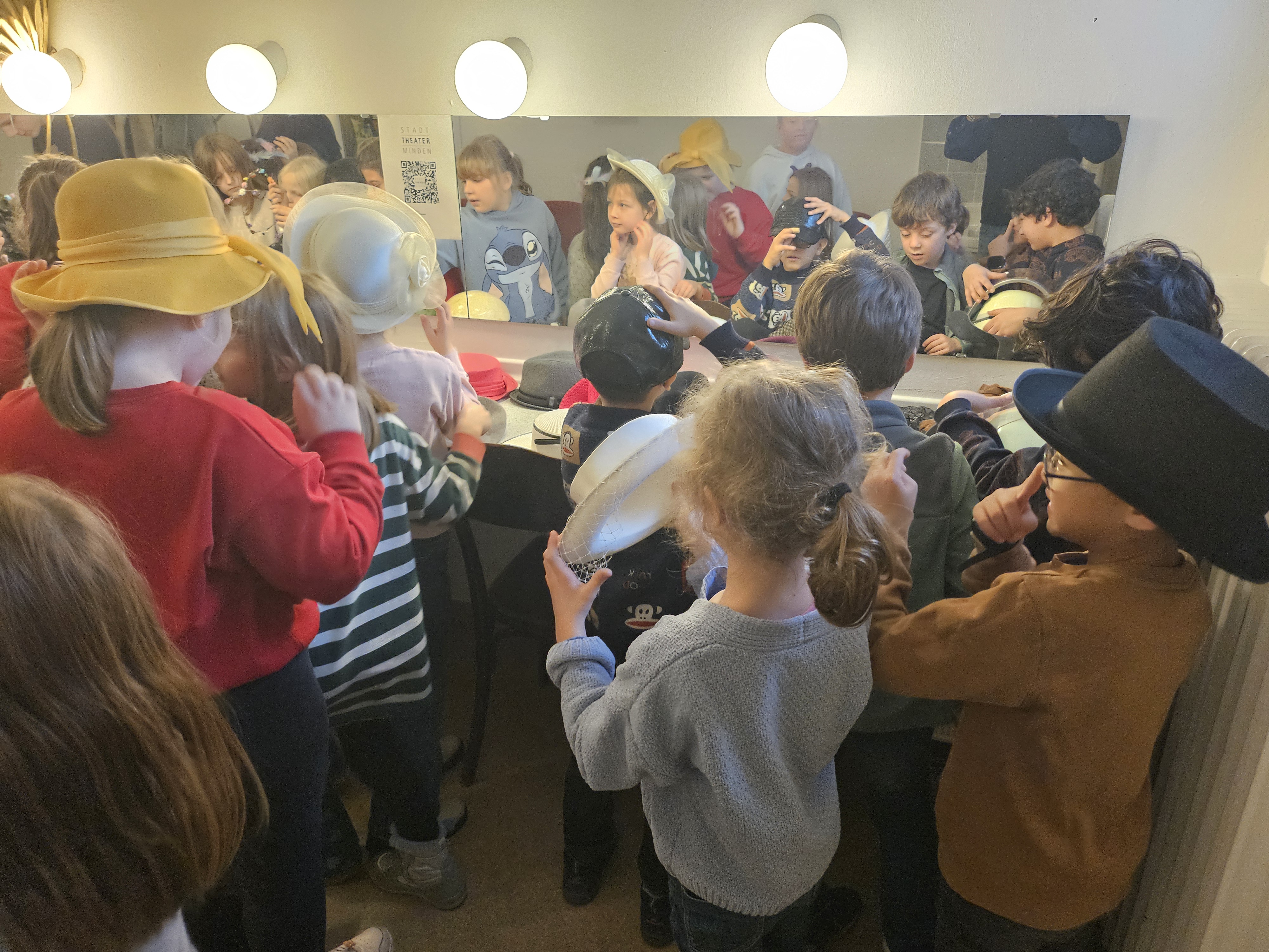 Im Rahmen der Kulturstrolche besuchten unsere zweiten Klassen das Stadttheater Minden und durften einmal hinter die Kulissen schauen. Besonders beeindruckend fanden die Zweitklässler die 16 Meter hohe Arbeitsbühne, die sie auch betreten durften. Sehr lustig war das Ausprobieren von Masken und Hüten in den Garderoben der Schauspieler.